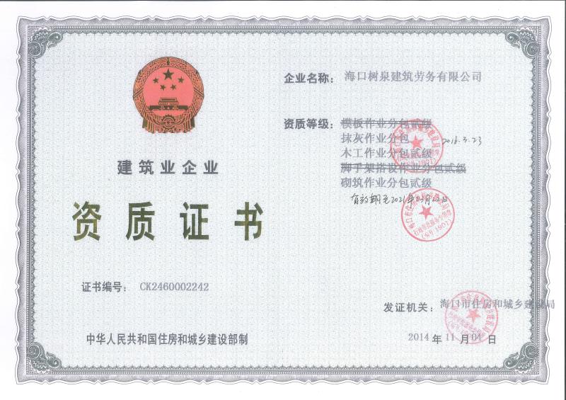 海口樹泉建筑勞務有限公司成立于2011年,公司位于???,其前身是一家專業建筑施工隊,自2004年即開始在海南從事建筑勞務施工。自成立至今,公司已經擁有一支科學管理、質量過硬、能打硬仗,搶工期的專業隊伍。能獨立承擔大中型工業與民用建筑 、室內外裝修、各類機電設備安裝工程。代表工程有??跒I海華庭、三亞時代海岸T01/02/04/05棟高層、合肥東?;▓@二期、陵水富力灣B區高層、三亞金中海(酒店)、瓊海大印經典花園、海口環球海景大酒店(四星級酒店,在建中)、陵水珍珠大廈(五星酒店)、??谌f達廣場、美蘭機場二期。